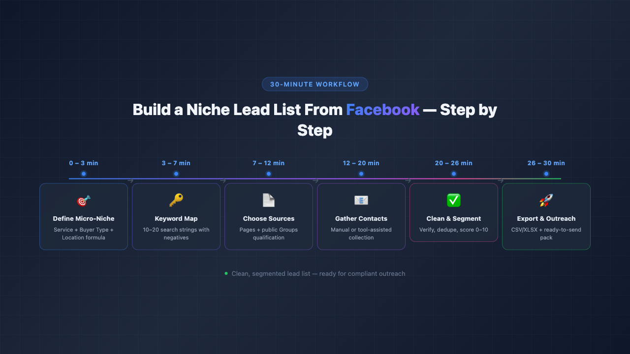 Learn how to build a clean, segmented lead list from Facebook in 30 minutes. Define micro-niches, choose sources, gather contacts, and export ready-to-send lists.