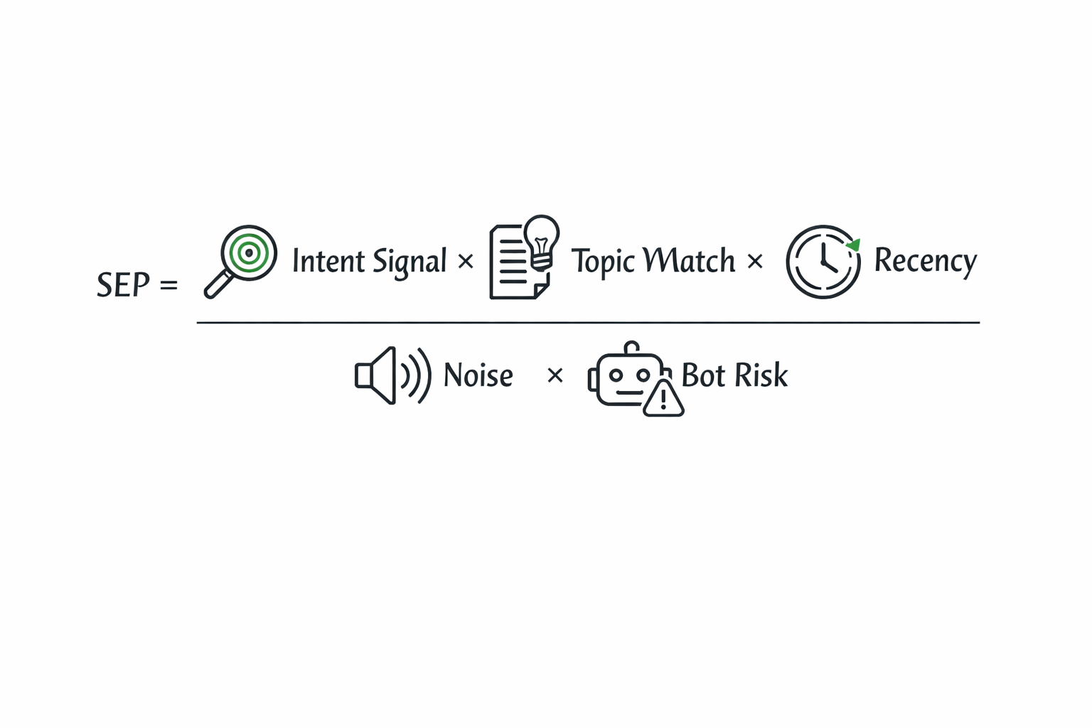 SEP = Intent Signal x Topic Match x Recency / Noise x Bot Risk