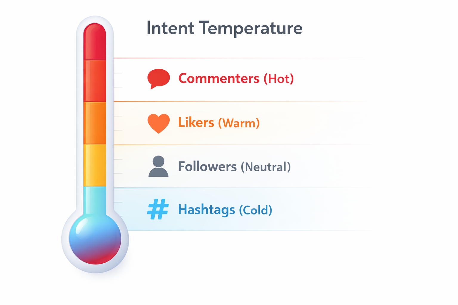 | Most direct path to high intent leads | Commenters | They revealed a need, question or opinion | Drama/viral posts cause noise inflation |