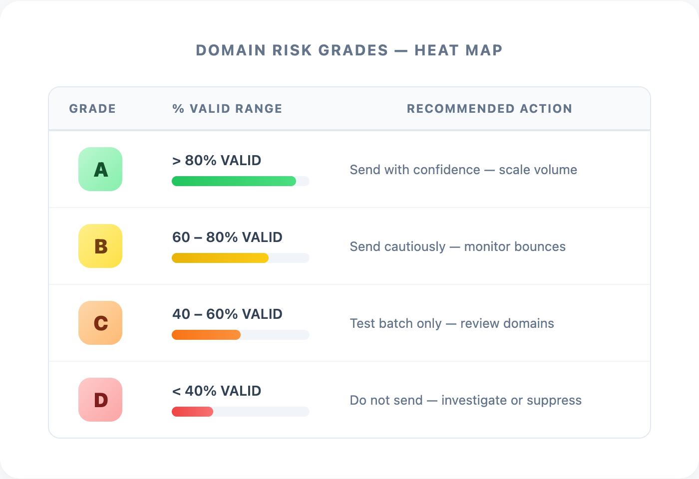 - Domain report: Identifying domains which drive risk (catch-all heavy, invalid spikes).