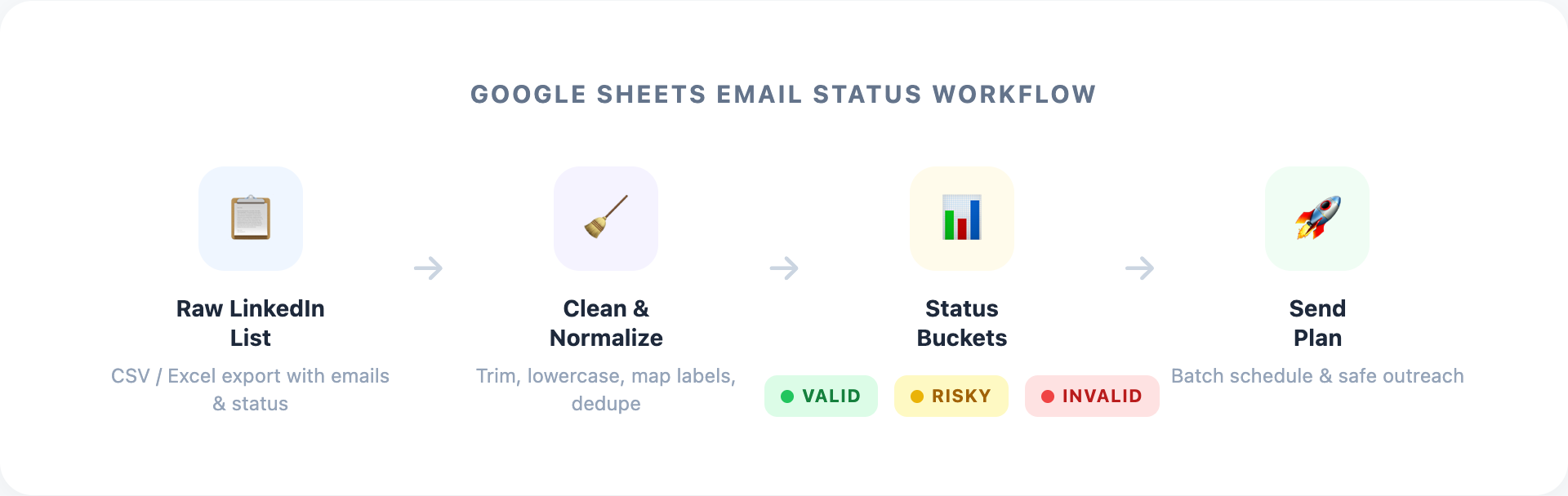 Build a Google Sheets template that normalizes LinkedIn email verification labels to VALID, RISKY, and INVALID, deduplicates leads, scores risk, and creates export-ready outreach buckets.