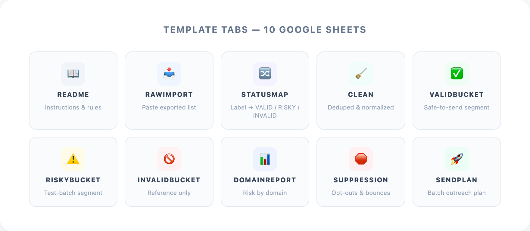 In this guide, you'll be creating a Google Sheets template that will automatically tidy up your list, clean up any verification labels (to make them VALID / RISKY / INVALID), create export-ready buckets and generate a simple send plan. You can use it with exports from any LinkedIn email scraper--then have the same workflow every time.
